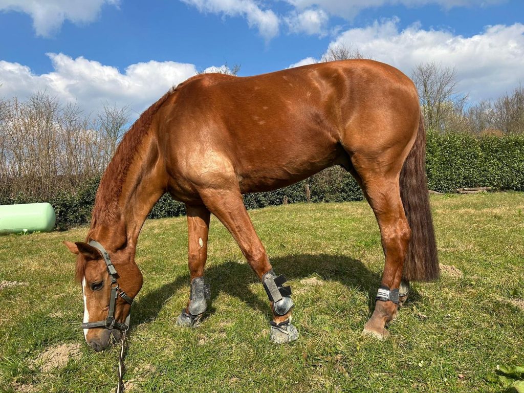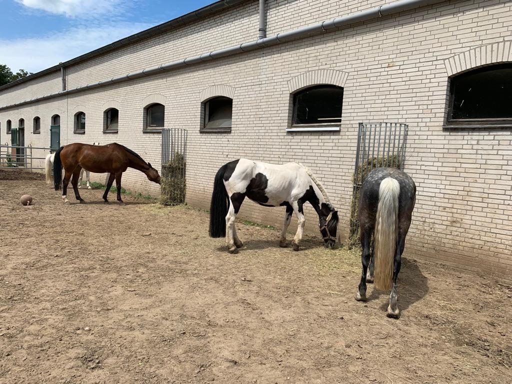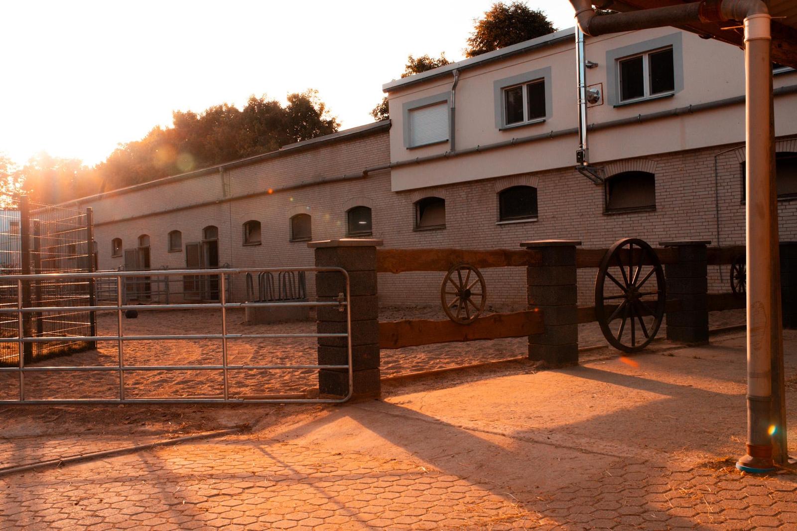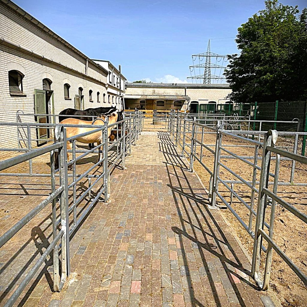 Das 600 m² große Paddock (20 × 30 m) mit Sandboden befindet sich direkt am Hof und ermöglicht den Pferden regelmäßige Bewegung außerhalb der Box.